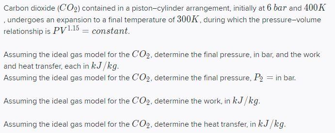 Carbon dioxide CO2 contained in a pistoncylinder arrangement initially at 6 bar and 400 K undergoes an expansion to a final temperature of 280 K during which the pressurevolume relationship is pV125 constant. The cylinder contains carbon dioxide at 200 kPa and ambient temperature of 290 K. Carbon dioxide CO2 contained in a pistoncylinder arrangement initially at 6 bar and 400 K undergoes an expansion to a final temperature of 298 K during which the pressurevolume relationship is pV12 constant.